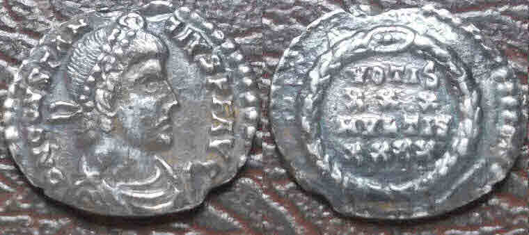 337-361 A.D., AR Siliqua; nicely toned with some blue colour;
